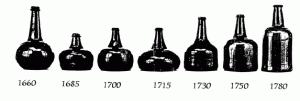 Wine bottles, as we know them, did not appear until the early seventeenth century when improvements in technology and the handling of glass allowed the glassmakers to vary shapes with greater control and to produce stronger glass. Even with the improvement in the quality, wine was usually bought and stored in barrel and was only decanted into bottles for service at the table. Often sporting the family seal, they were globular in shape, with a short neck and had slight variations in capacity. The sloping-shouldered bottle started to appear around 1715 and by the mid eighteenth century this had evolved into the high-shouldered bottle.