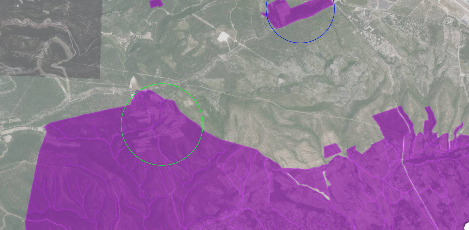 And let’s zoom in on the upper half. You’ll see two disparities. On the top-right is a patch of purple-coloured Bandol AOP, half a dozen kilometres from the rest of the appellation, separated by forest. The separating forest is not coloured purple (2nd photo, circled right in blue). On the left side is a vineyard, barely visible in the satellite imagery, half a dozen kilometres from the rest of the appellation, separated by forest. The separating forest is coloured purple (2nd photo, circled left in green).